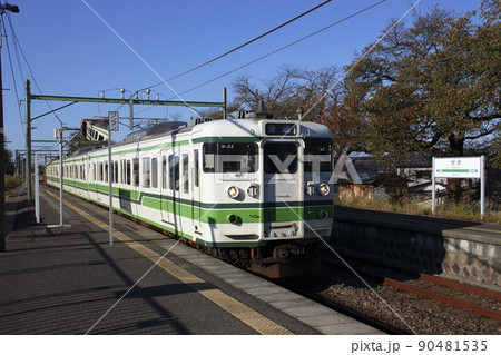 紅葉の水上駅に停車の上越線115系(水上⇔長岡)