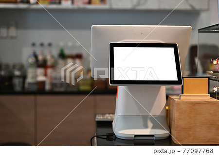 A touchscreen cashier machine with blank screen at modern coffee shop.