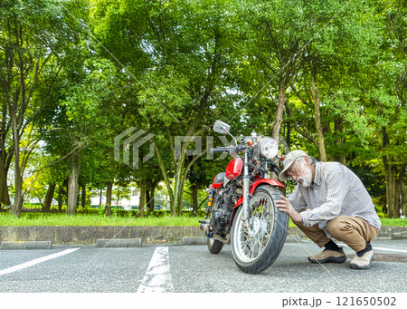 バイクライフ バイクを整備するシニアライダーのパーツカット