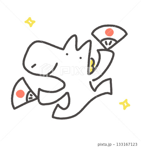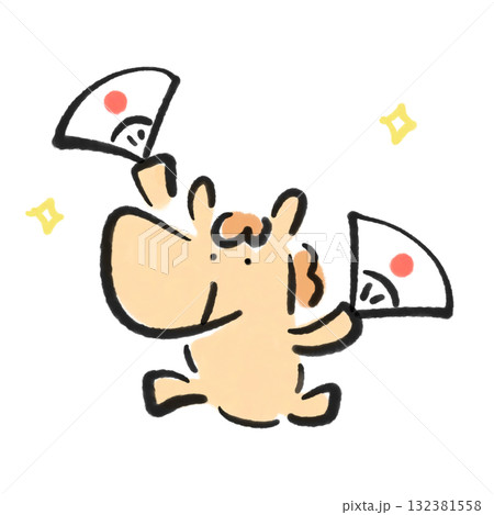 両手に扇子を持って踊る白馬 日の丸 正月素材