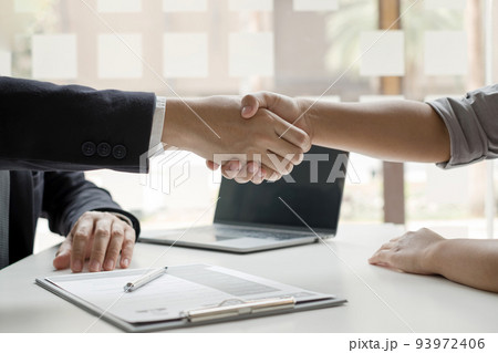 Employer shake hand with job applicants congratulates and welcomes new hires after successful negotiations for a job interview. Recruitment concepts