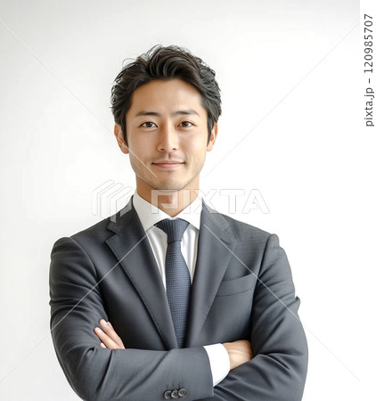 腕組みをするスーツ姿の日本人男性ビジネスマン