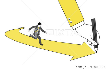 鉛筆で描かれた矢印とその上を走るビジネスマンのイラスト、ベクター