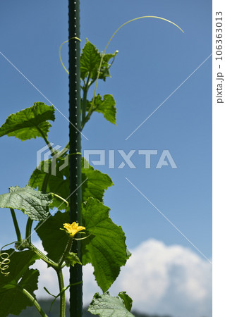 北杜市白州町、家庭菜園のキュウリと入道雲