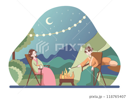 Asian people enjoying their free time by doing leisure activities and hobbies. Japanese characters in traditional clothes sitting next a campfire. Glamping or outdoor picnic. Flat vector illustration