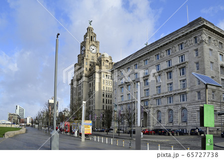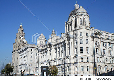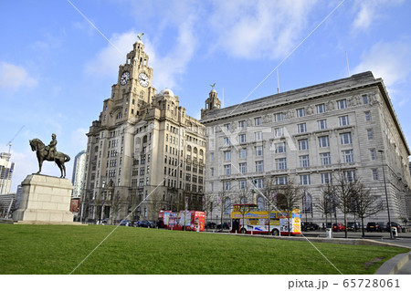 リバプールの世界遺産キューナードビルとロイヤル・リヴァービルを背景にエドワード7世彫像