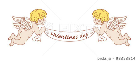 バレンタインデーのバナーを持つ二人のキューピッド - バレンタイン素材 塗りあり