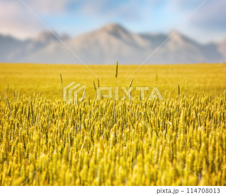 wheat field in slovakia on a sunny day. rural landscape in early summer. high tatra mountain ridge blurred in the distance. composite image