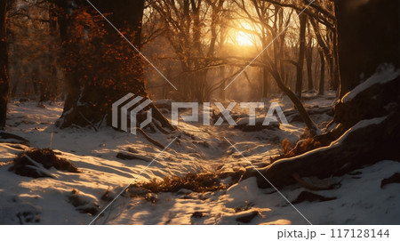 beautiful winter landscape, tree branches in snow covered forest, bright sunlight and beautiful nature