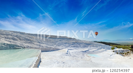 Amazing white travertine terrace formations, pool with clear hot water from thermal springs in Pamukkale, Denizli Province in southwestern Turkey