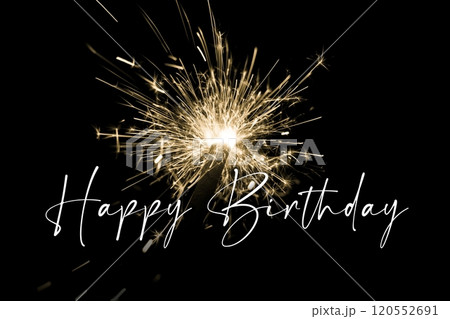 Stylish happy birthday yellow pyrotechnics sparkler magic. Entertainment celebration party time from january to december. Premium nightlife visual with glowing light sparks on dark background.