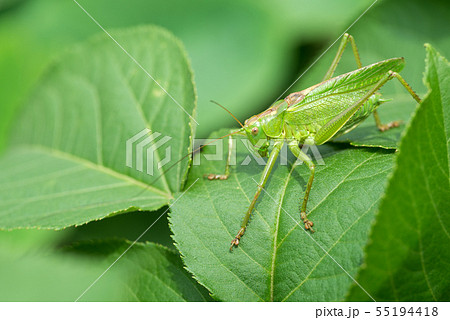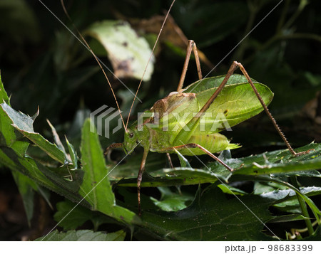 緑の葉の上にいるヤブキリの成虫