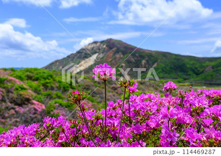 阿蘇山頂周辺 阿蘇山 中岳火口を背景に映える絶景ミヤマキリシマの花風景(阿蘇山中岳・阿蘇火口周辺)