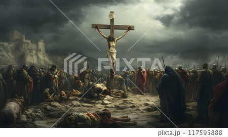 ゴルゴダの丘でキリストが十字架にかけられる風景