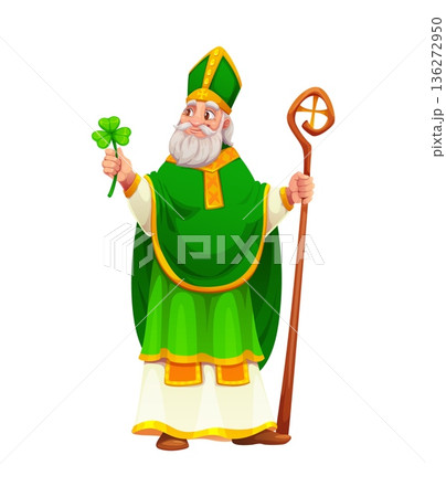 Cartoon Saint Patrick Character. Vector patron Saint of Ireland, dressed in traditional green and gold robes, holding a bishops staff and trefoil shamrock leaf. Legendary Irish Christianity personage