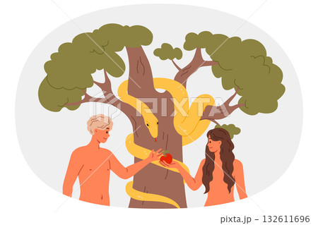 Bible scenes with holy religion characters. Sacred books and myphs people, mythology and christian stories. First person in garden, recent vector concept