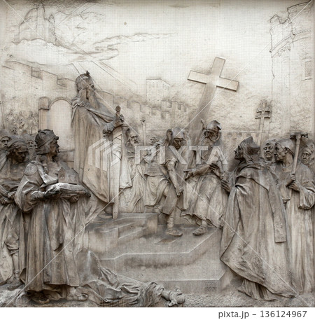 A relief plaque on the right side of the church tells of the legend of Charlemagne, Church of Saint Peter in Vienna, Austria