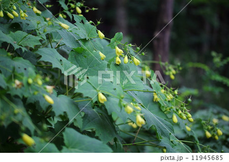紀伊半島、四国・九州の山地に自生する葉を背景に下を向いて咲く黄色の花の花序が綺麗なキレンゲショウマ