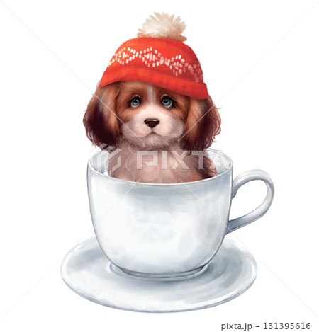 Adorable puppy wearing knitted red winter hat, sitting inside white teacup