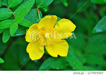 雨が降っている中で咲くキンシバイの花(ヒペリカム)(夏、六月)