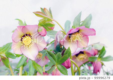 季節の花早春の素材・クリスマスローズの白い萼片・群生横位置