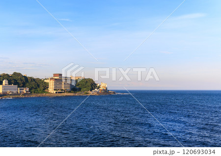 川奈港。沖に初島が見える。 伊豆半島走る伊豆急行線の車窓からの風景。伊豆急行線車内