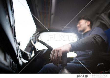 トラックの運転席で頭を抱える男性