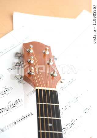 アコースティックギターのネックのアップ・楽譜と音楽イメージ