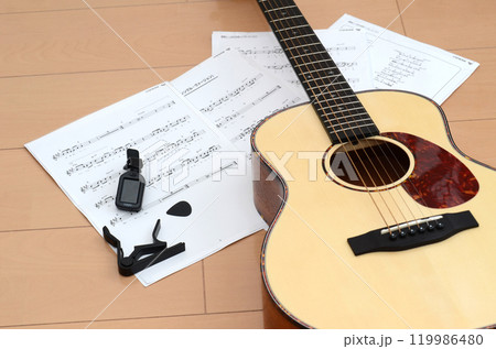 アコースティックギター・カポタスト・楽譜と音楽イメージ