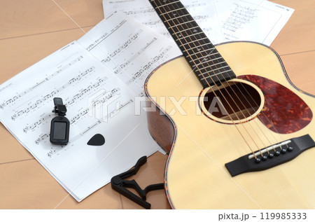 アコースティックギター・カポタスト・楽譜と音楽イメージ