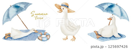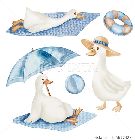 Whimsical watercolor geese enjoying summer by the beach under umbrellas and sun hats