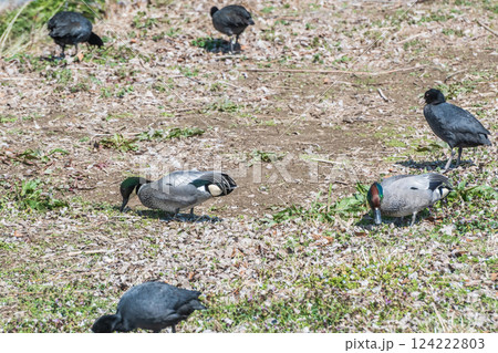 淀川の河川敷で食べ物を探すヨシガモ(オス)とオオバン