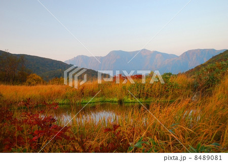 尾瀬ヶ原_山の紅葉と草紅葉_池塘_10月_1