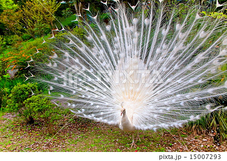 知らんふりの雌の白孔雀にプロポーズの雄印度孔雀