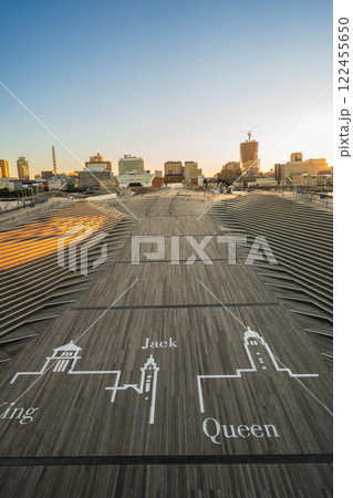 大桟橋のウッドデッキに描かれた「横浜三塔」