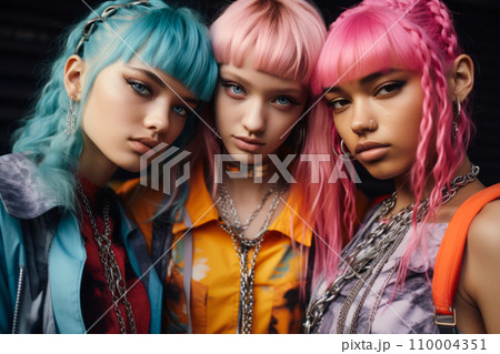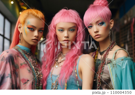 Three Gen Z models with vibrant pastel-colored hair and bold makeup showcase an eye-catching, featuring colorful hair, heavy eye makeup, and hand-painted designs on cheeks.