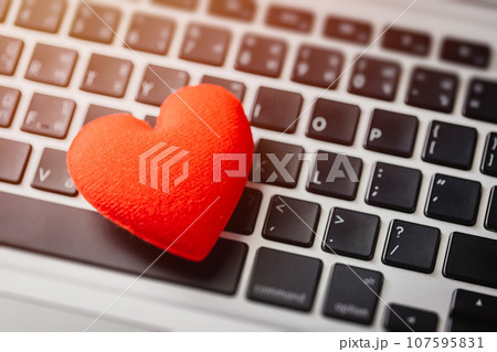 Red heart on laptop keyboard flirt love chat or lover online text messenger for meeting date