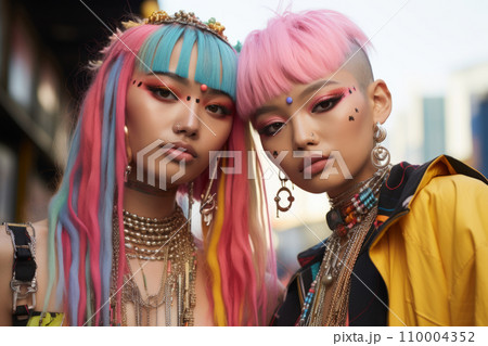 Two Gen Z models with vibrant pastel-colored hair and bold makeup showcase an eye-catching, featuring colorful hair, heavy eye makeup, and hand-painted designs on cheeks.