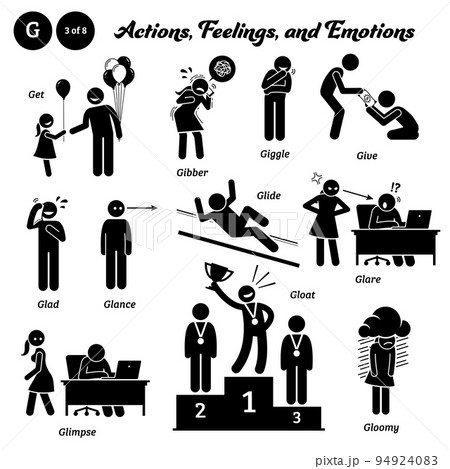 Stick figure human people man action, feelings, and emotions icons alphabet G. Get, gibber, giggle, give, glad, glance, glide, glare, glimpse, gloat, and gloomy.