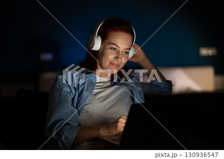Calm woman with laptop watches video with headphones, spends time online late at night in dark room