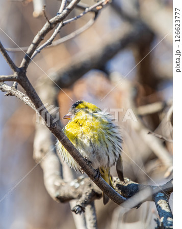 Eurasian siskin male, latin name spinus spinus, sitting on branch of tree. Cute little yellow songbird.