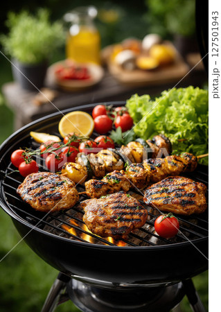Grilled chicken barbecue with vegetables on outdoor charcoal grill, bbq and summer theme