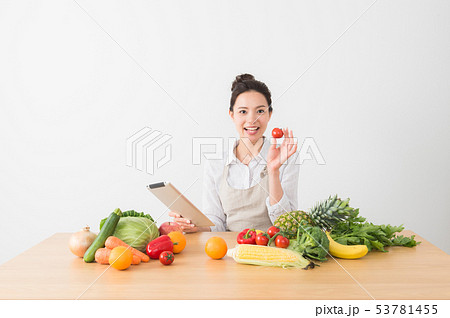 タブレッドを見て料理をする女性