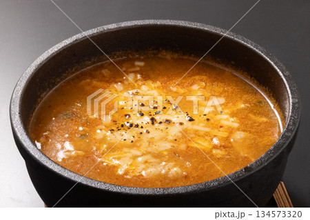 Delicious Korean Sundaegukbap (blood sausage rice and soup) served in a steaming earthenware pot with radish kimchi (Kkakdugi).