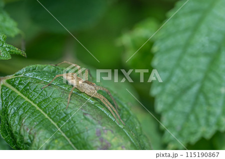 葉の間に身を隠すハエトリグモ(ネコハエトリ)