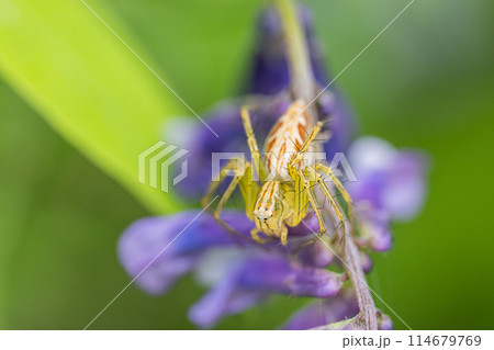 生き物 蜘蛛 アマギエビスグモ、カニグモの仲間の小さなクモ。腕(?)を広げて待ち伏せ中