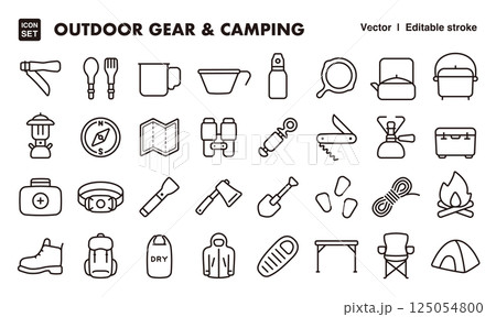 アウトドアギアとキャンプ道具のアイコンイラストセット EPS版は線の太さ等編集可能