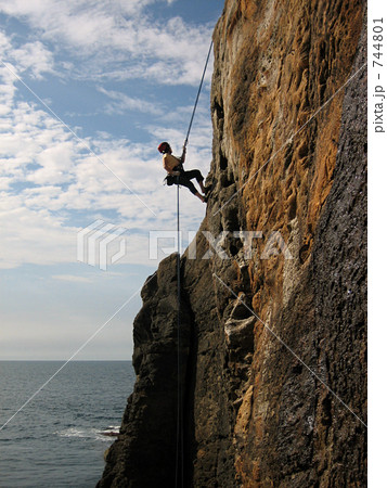 Climber is rappeling from the mountains summit.