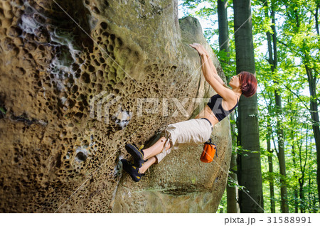 クライミングシューズを履く若い女性 ボルダリングイメージ