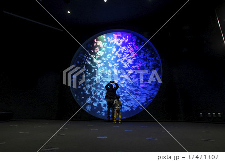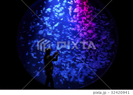 クラゲ水族館 円水槽 加茂水族館 水槽のクラゲを見る人 イメージ素材 山形観光スポット